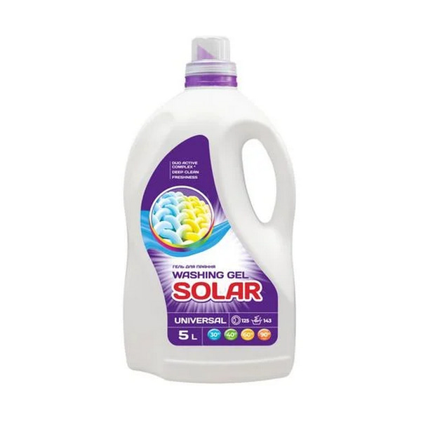 Гель для прання Solar Universal, 5 л – універсальний концентрований засіб для прання всіх типів тканин. Ефективно видаляє забруднення навіть у холодній воді, зберігає яскравість кольорів і структуру волокон. Підходить для ручного та машинного прання, не містить фосфатів, має приємний аромат і легко виполіскується.