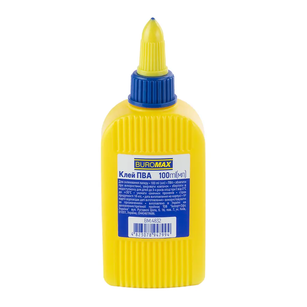 Клей ПВА з дозатором Buromax BM.4832, 100 мл — універсальний клей для склеювання паперу, картону та інших легких матеріалів. Підходить для використання в офісі, школі та для творчих робіт.