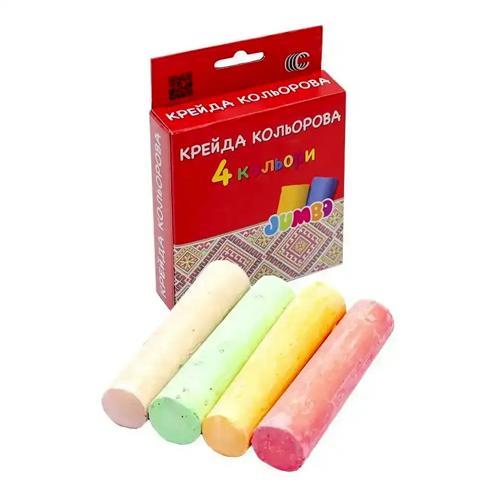Крейда кольорова JAMBO “С” (85497) — набір із 4 яскравих кольорів для малювання на асфальті, дошці або папері. Має зручну циліндричну форму, легко тримається в руці та не кришиться під час використання. Крейда залишає насичений слід, добре помітний навіть на темних поверхнях, і легко змивається водою. Підходить для творчих занять, ігор на вулиці, шкільного або дошкільного використання.