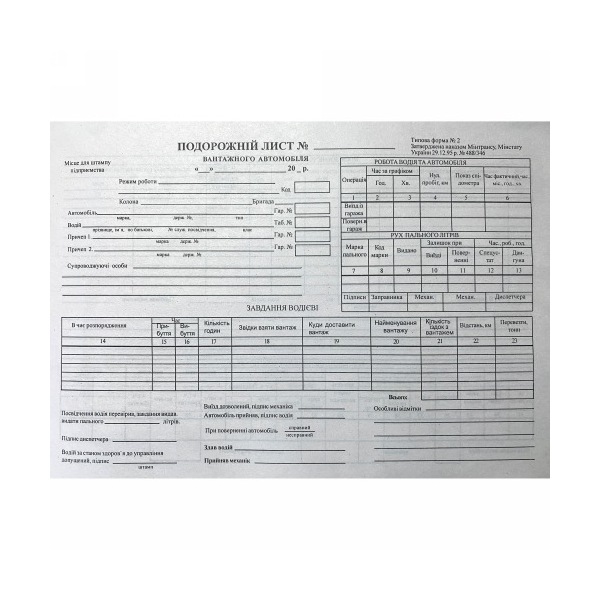 Подорожній лист вантажного авто, не нумерний, форма № 2, А4 100арк