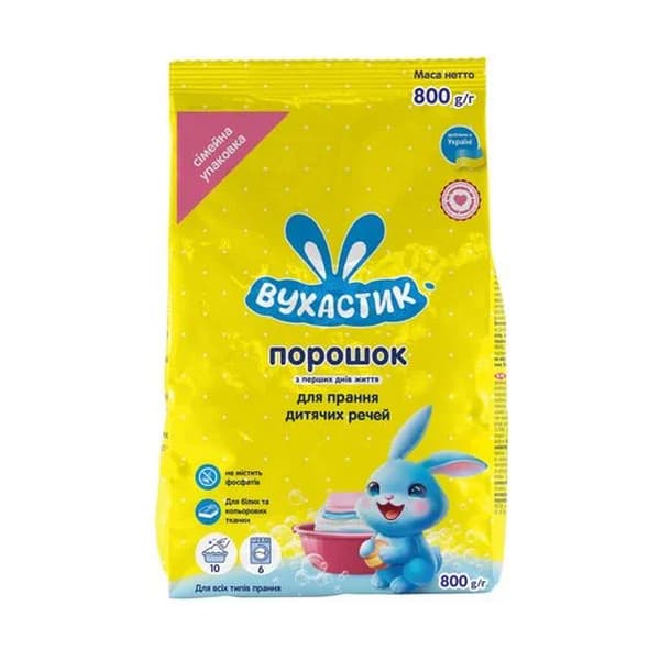 Пральний порошок “Вухастик” для прання дитячої білизни. Підходить для новонароджених, безпечний для чутливої шкіри. Розрахований на 6 циклів прання. Упаковка – 800 г.